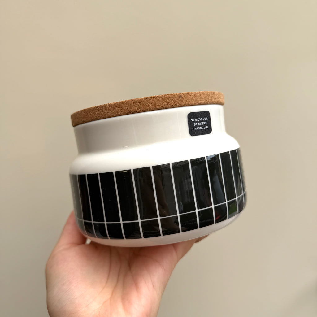 The jar is made of white stoneware. The jar has a cork lid, which features the Marimekko logo on the inside. We recommend washing the lid by hand.